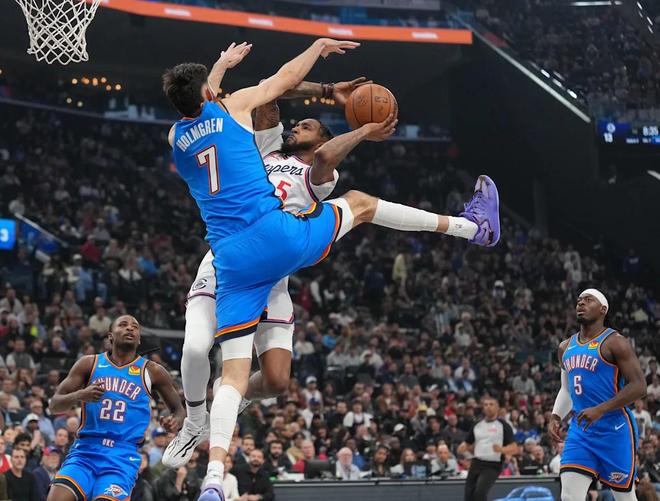 雷霆队,以赛亚乔12中7,三分球10中6怒砍22分3板、华莱士9中5得到12分3板1助、维金斯10中5得到12分2板2助、霍姆格伦8中4得到11分5板3助3帽、哈尔滕施泰因6中4得到10分7板3助4断、米切尔8分4板3助4断、卡鲁索8分1板3助2断、多特6分3板、杰林-威廉姆斯3分5板。